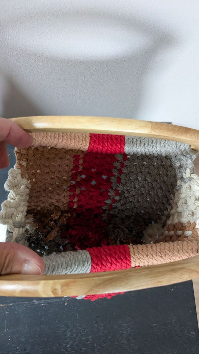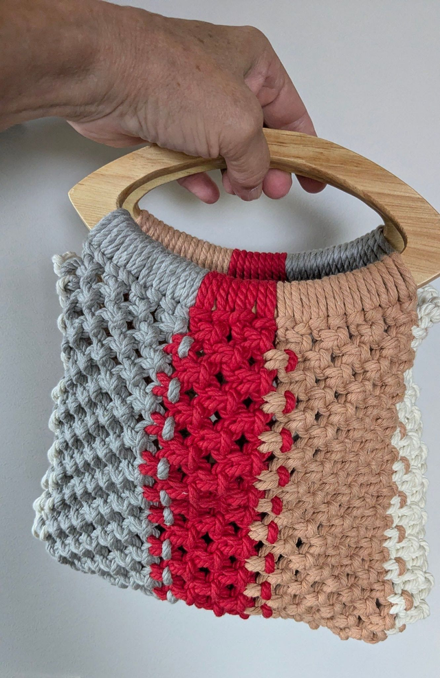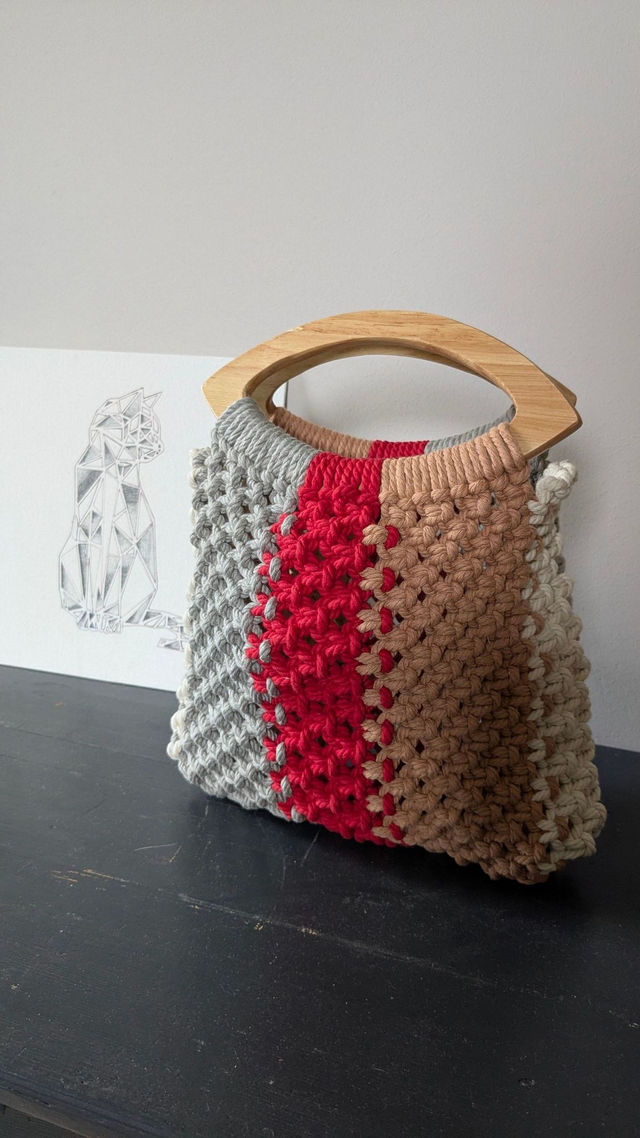 Sac en macramé de coton multicolore avec anse en bambou – café, blanc, rouge et gris. Hauteur: 20 cm; Largeur: 24 cm. Léger et chic, il se destine à transporter l’essentiel avec style.